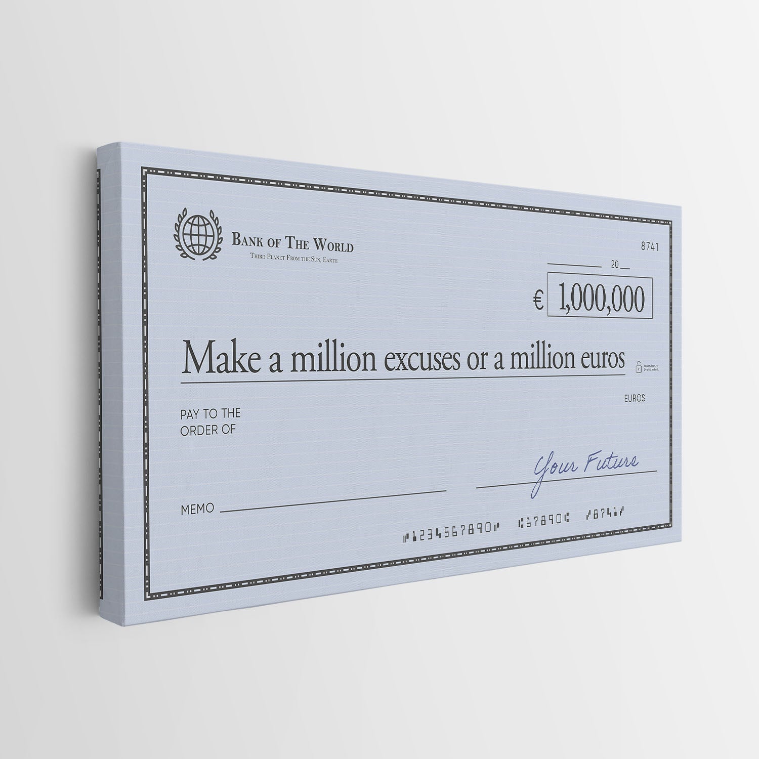 Turn a million excuses into a million euros with our Million Excuses (Euro Edition) canvas art featuring bank check in Euros.