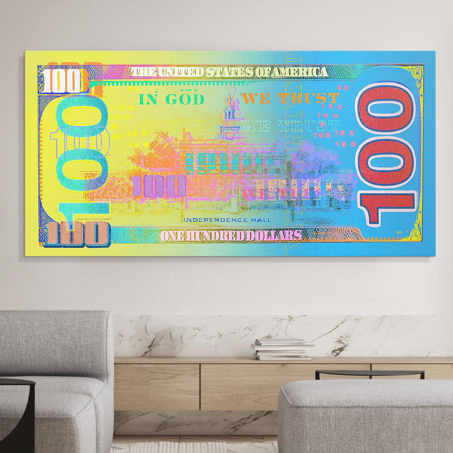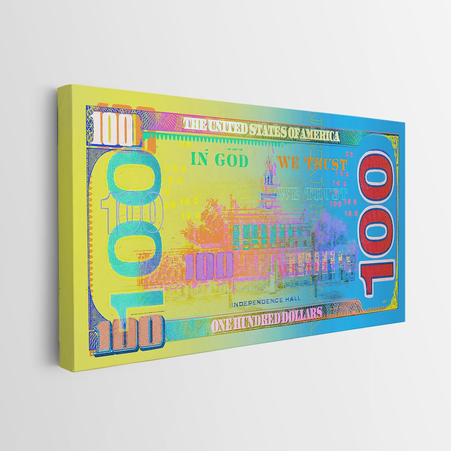 Enhance your space with the Paper Jam Back canvas art, showcasing the colorful reverse side of a hundred-dollar bill. Complementing our Paper Jam money wall art, this piece adds a unique perspective on financial ambition and creativity.